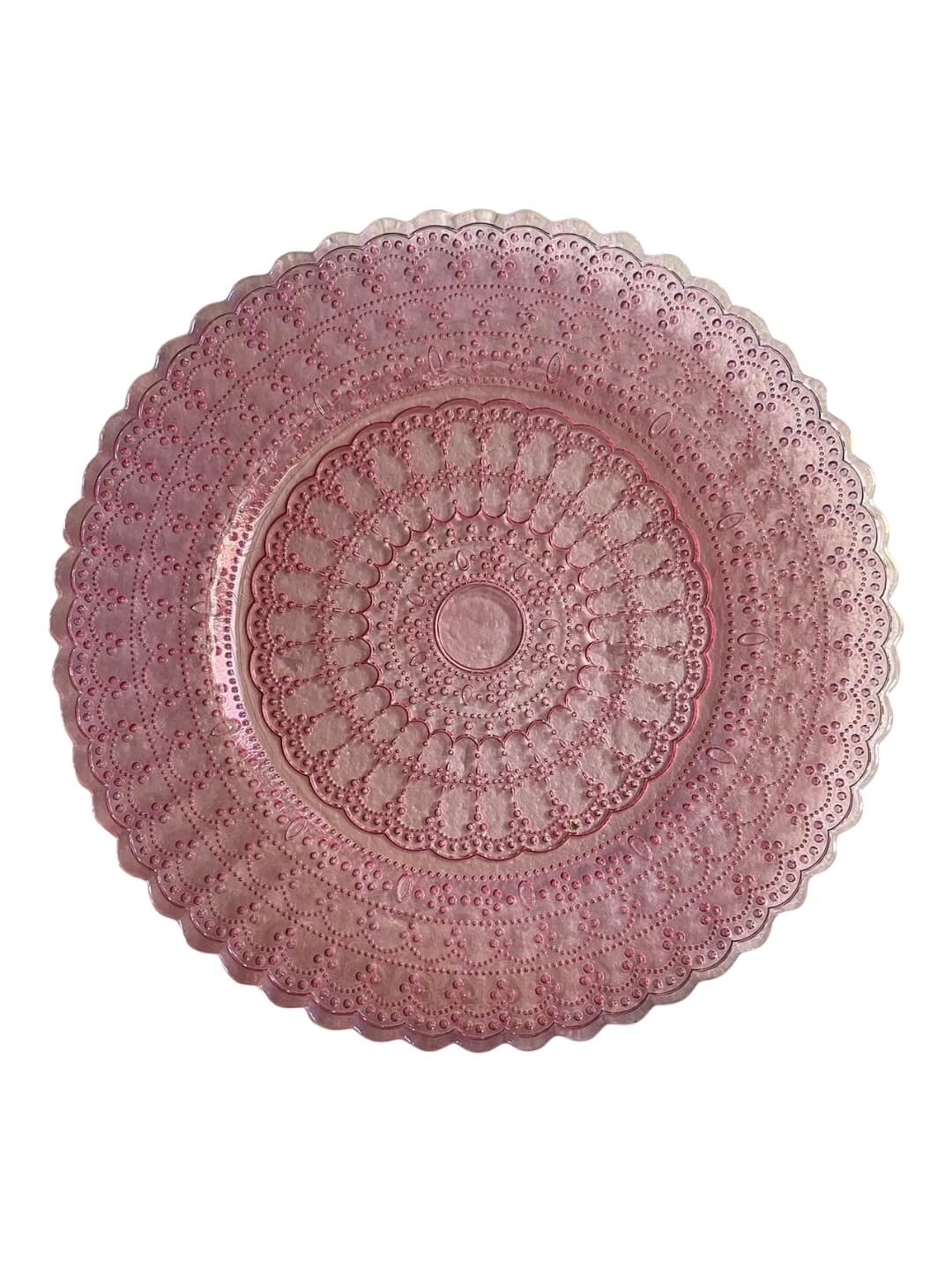 Add a whisper of colour and vintage-inspired elegance to your table with the Antoinette Pink charger plate. Crafted from fine glass, this piece features intricate, embossed detailing and a soft, transparent pink tint - delivering just the right amount of colour while maintaining a refined, airy look. The subtle blush tone is perfect for romantic weddings, spring celebrations, or any event that calls for a gentle touch of luxury.