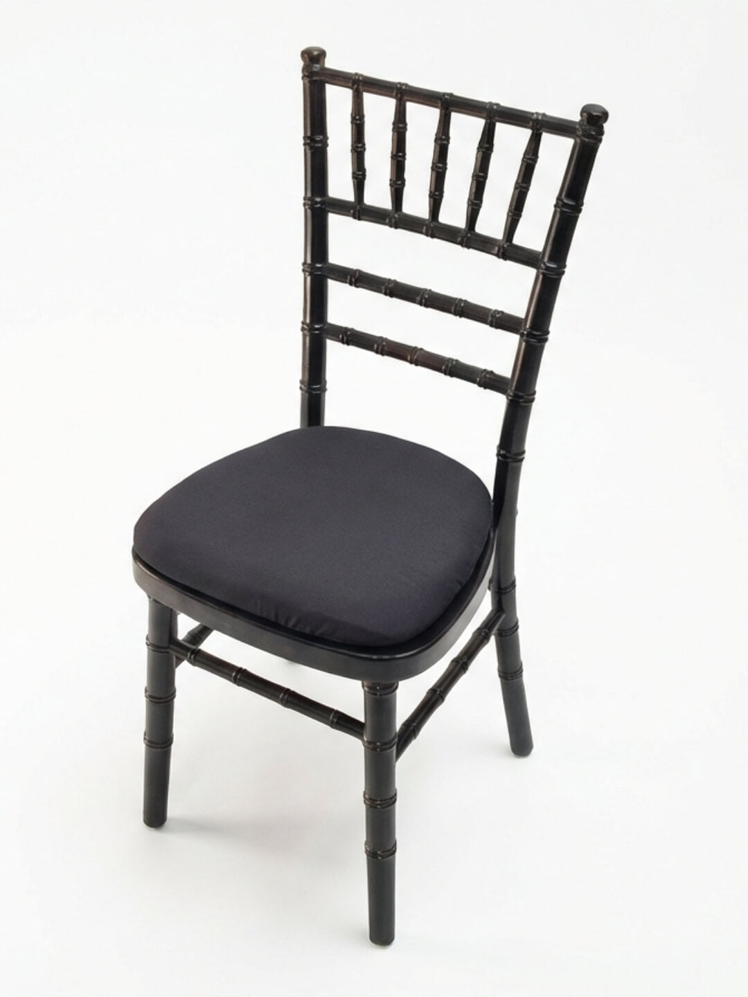 • The Chiavari Chair - Black features a black wooden frame with a faux bamboo design and a cushioned black seat, offering stylish event seating. Photographed against a white background.