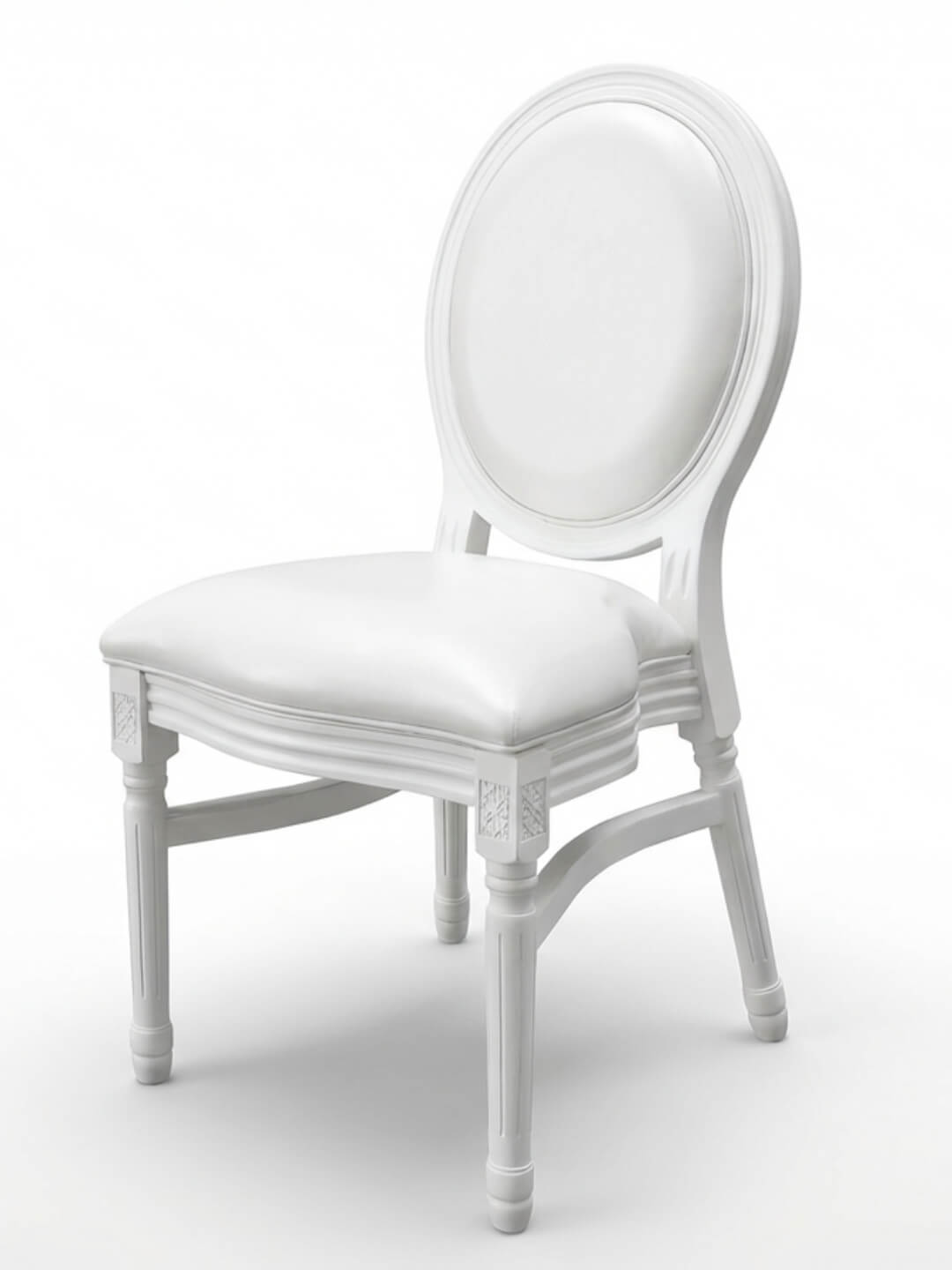 Channel timeless French elegance with the Louis Chair - a nod to the indulgent style of King Louis XVI. Finished in a crisp semi-gloss white, this chair features a luxurious faux leather seat and round backrest for both comfort and sophistication. The carved wooden frame and classic silhouette bring a sense of grandeur to any occasion, making it the perfect choice for weddings, galas, and exclusive celebrations. The Louis Chair’s opulent design stands out in both traditional and modern settings, offering a statement piece that elevates your tablescape.