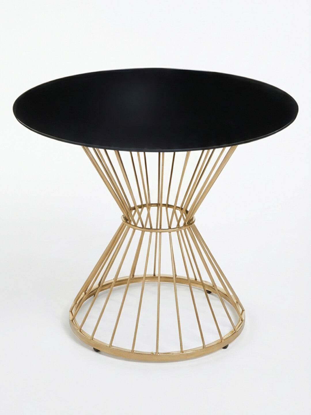 Make a modern statement with the Orbit Table - a striking blend of sculptural design and contemporary elegance. Featuring a bold black glass top and a geometric gold wire base, this piece brings instant sophistication and visual interest to any event setting. The hourglass-inspired frame creates a sense of lightness while remaining sturdy and versatile, making Orbit ideal for lounge areas, cocktail spaces, or as a chic accent table.