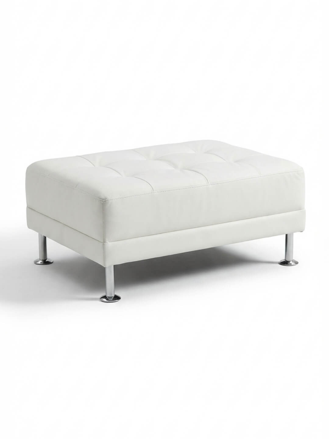 Add a crisp, modern touch to your space with the Soho Pouffe. Upholstered in sleek white faux leather with subtle tufting, this versatile pouffe features a minimalist cube silhouette and polished chrome legs - offering both comfort and contemporary style. The Soho Pouffe is ideal as extra seating, a chic footrest, or a low table for trays and décor in lounge areas, cocktail parties, or corporate events.